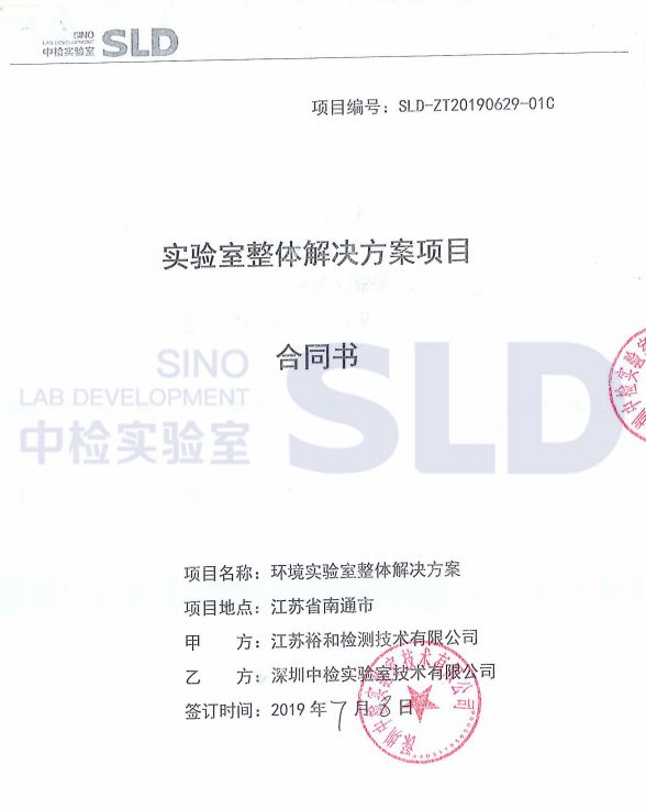 2019年7月8日,SLD中检实验室技术与江苏裕和检测技术有限公司签订环境实验室整体解决方案项目合同。该项目服务内容包括实验室规划设计、工程监理、实验室验收、实验室运营管理咨询、实验室CMA认证咨询等。项目地点位于江苏南通市,实验室面积约1200平方米。